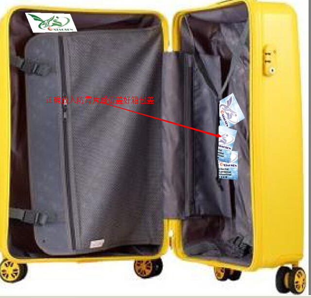 2)蓋好箱蓋後,因箱包(bāo)外套PE袋或者外箱(紙盒),可以在PE袋(dài)子內(或紙(zhǐ)盒)內也放置兩到三片(piàn)防黴片,可預防箱包(bāo)在倉儲或者海上長時運輸發(fā)黴長斑。
